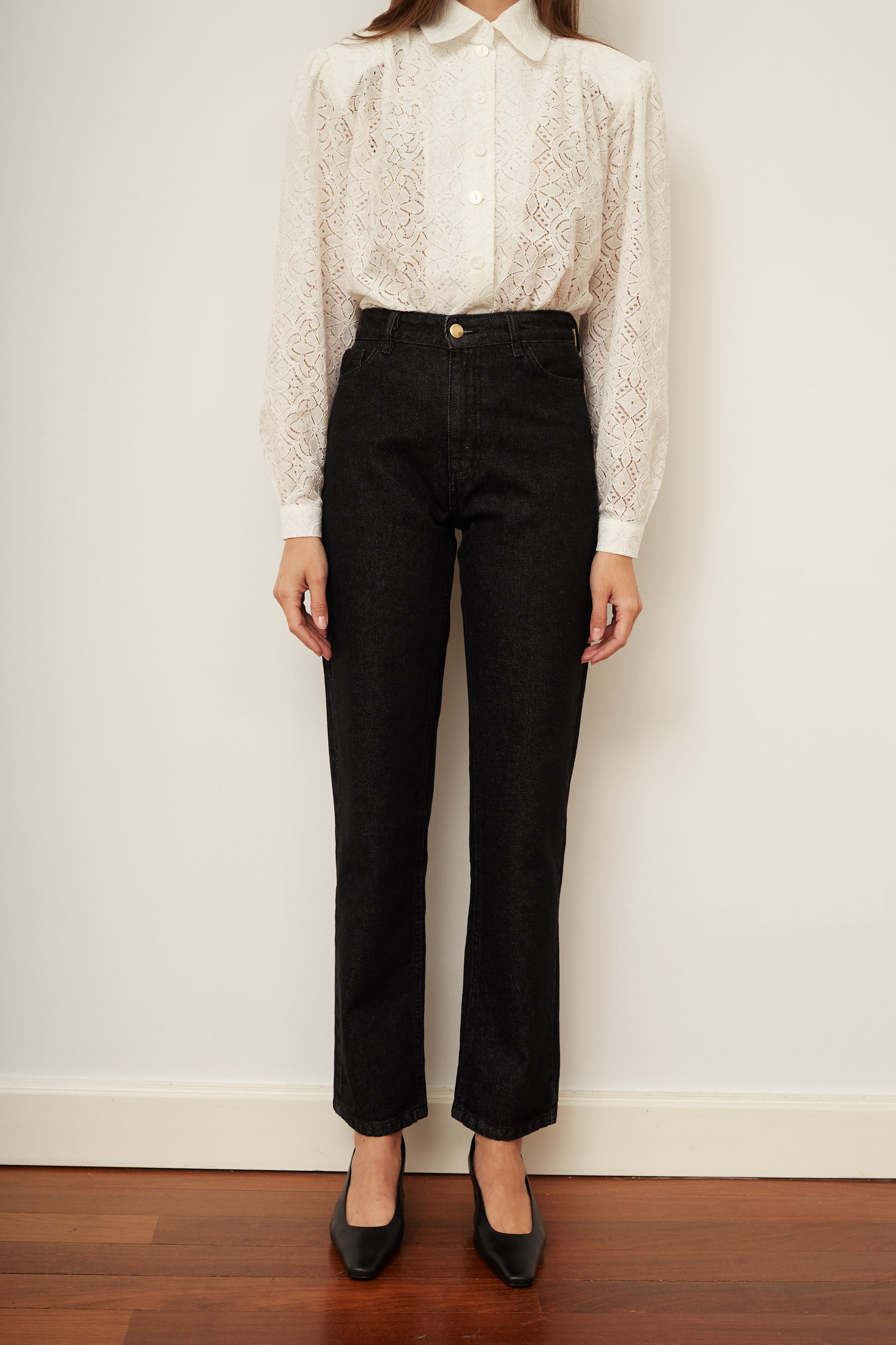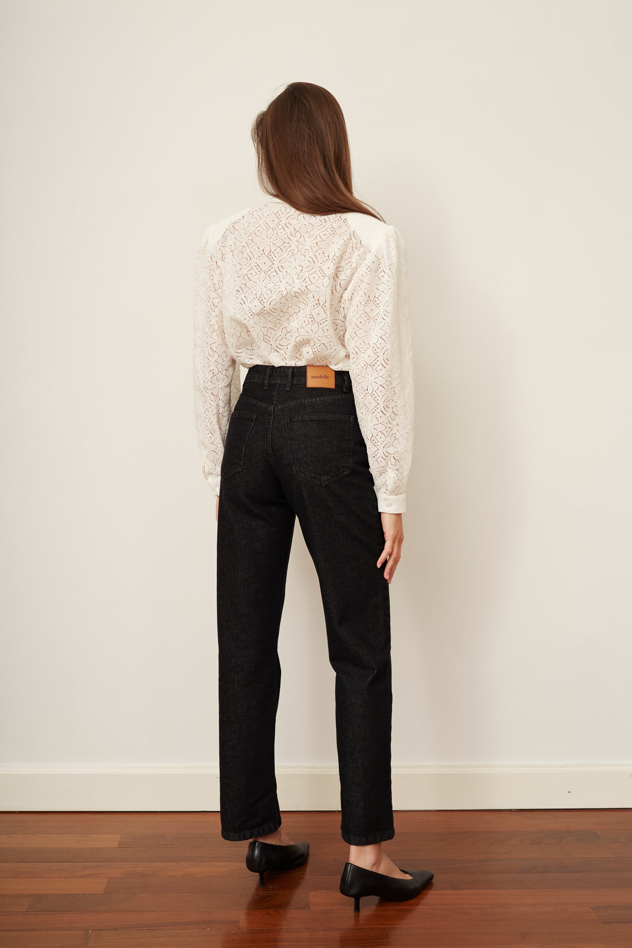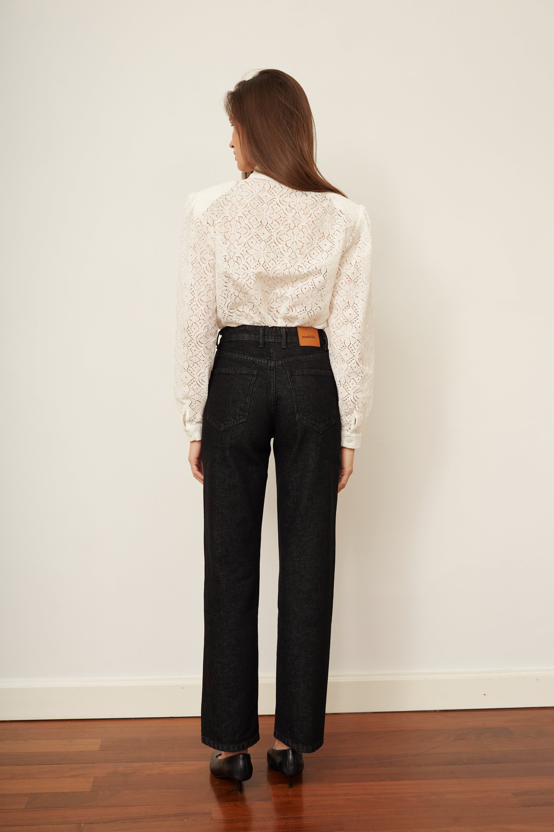 Spodnie jeansowe z wysokim stanem i prostą nogawką wykonane z bawełny. Spodnie mają długość za kostkę, są dopasowane w biodrach i luźniejsze w udach i łydkach. Doskonale układają się na sylwetce. Z tyłu naszyliśmy skórzaną plakietkę z wytłoczonym logo marki.