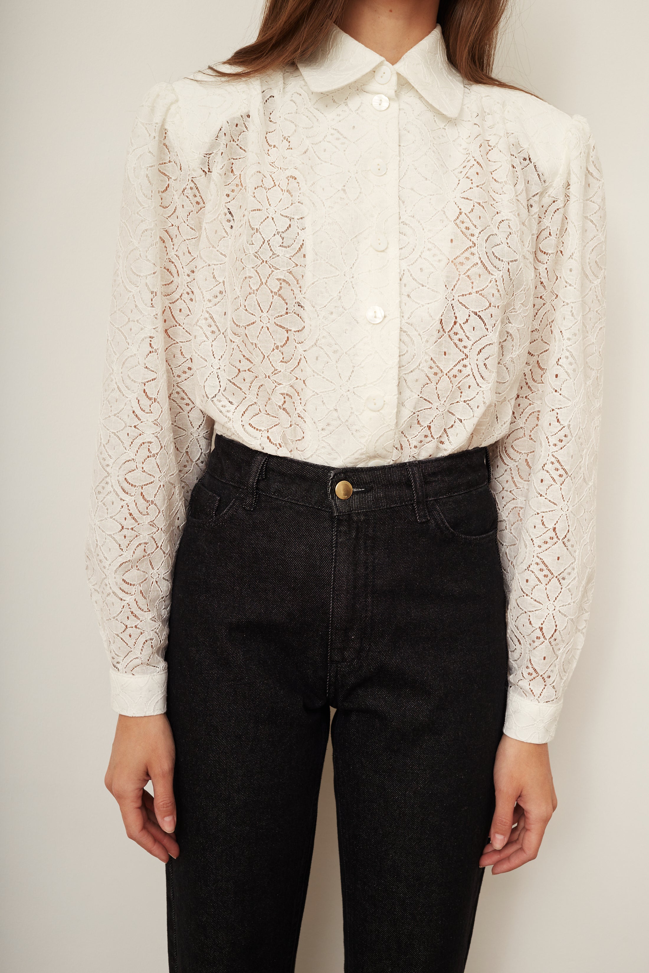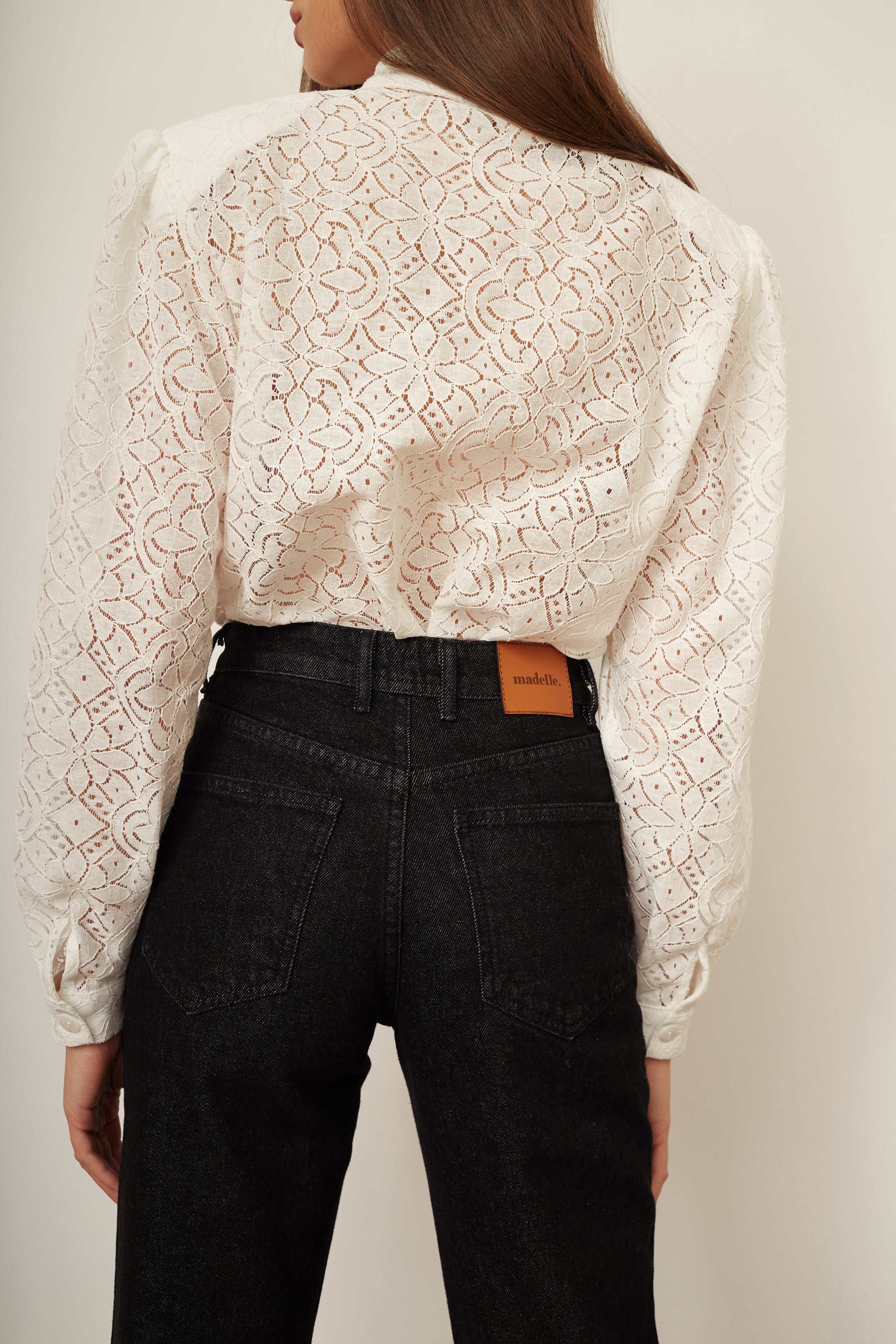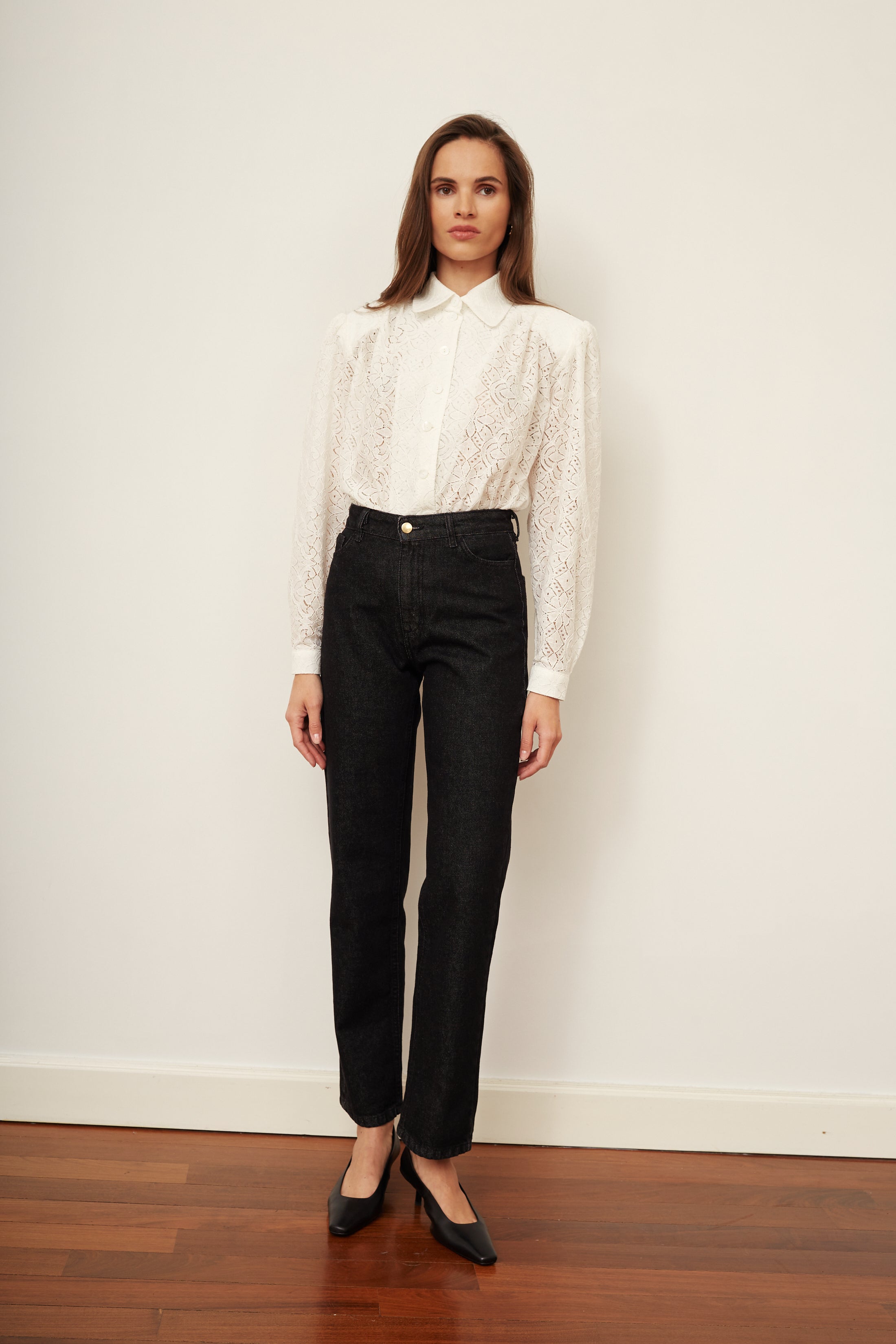 Spodnie jeansowe z wysokim stanem i prostą nogawką wykonane z bawełny. Spodnie mają długość za kostkę, są dopasowane w biodrach i luźniejsze w udach i łydkach. Doskonale układają się na sylwetce. Z tyłu naszyliśmy skórzaną plakietkę z wytłoczonym logo marki.