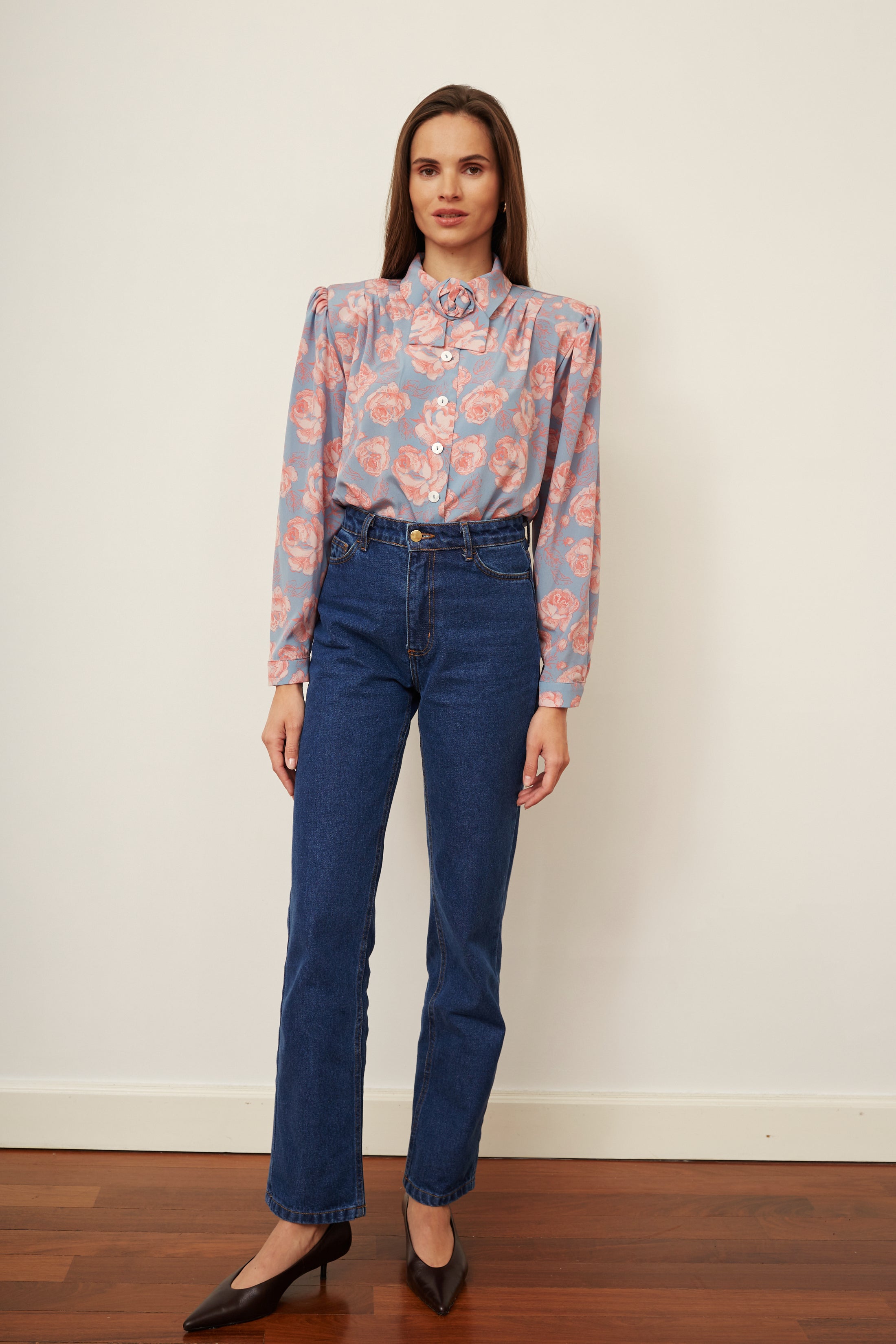 Heloise wykonana jest z jedwabiu drukowanego w nasz autorski różany wzór na błękitnym tle.