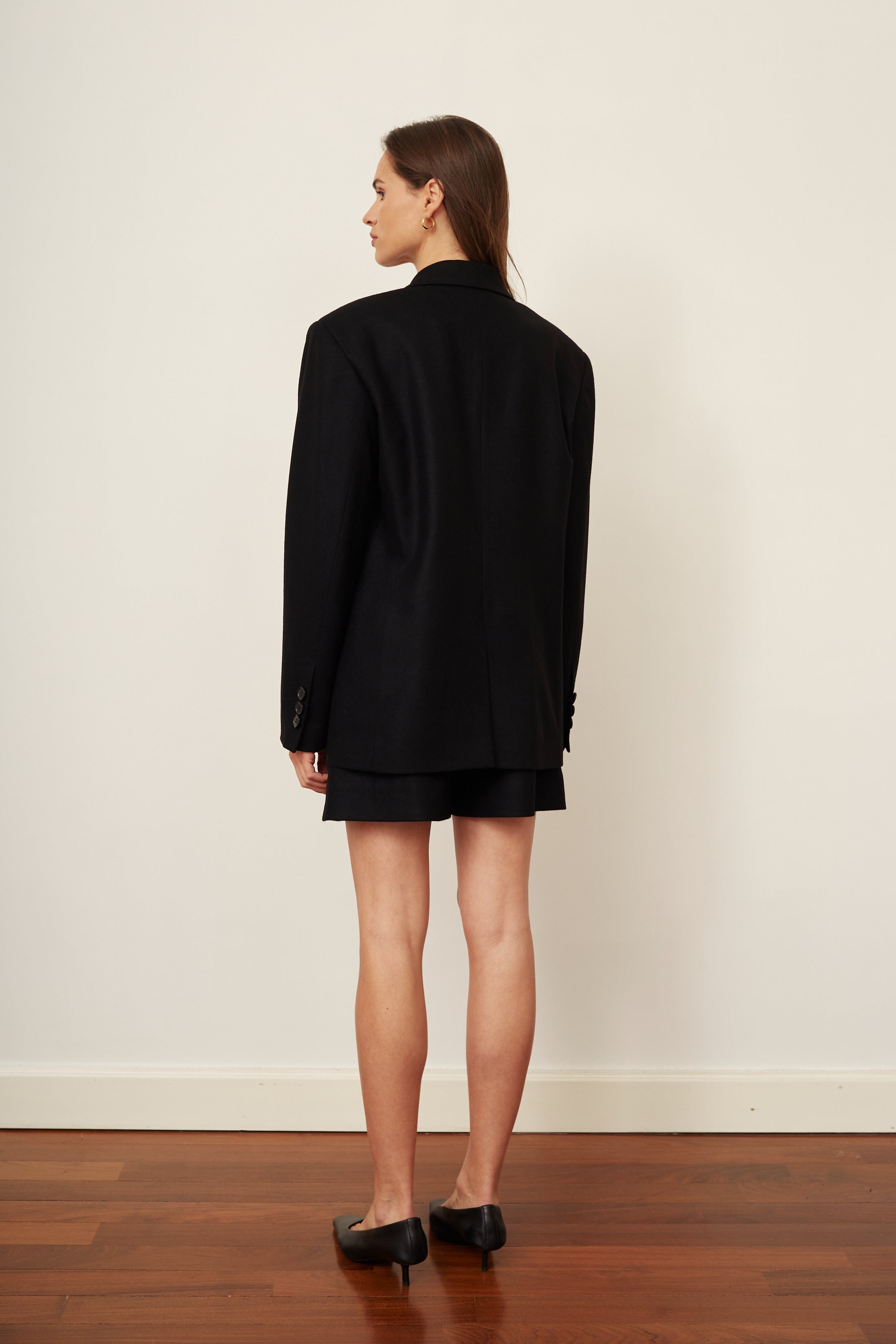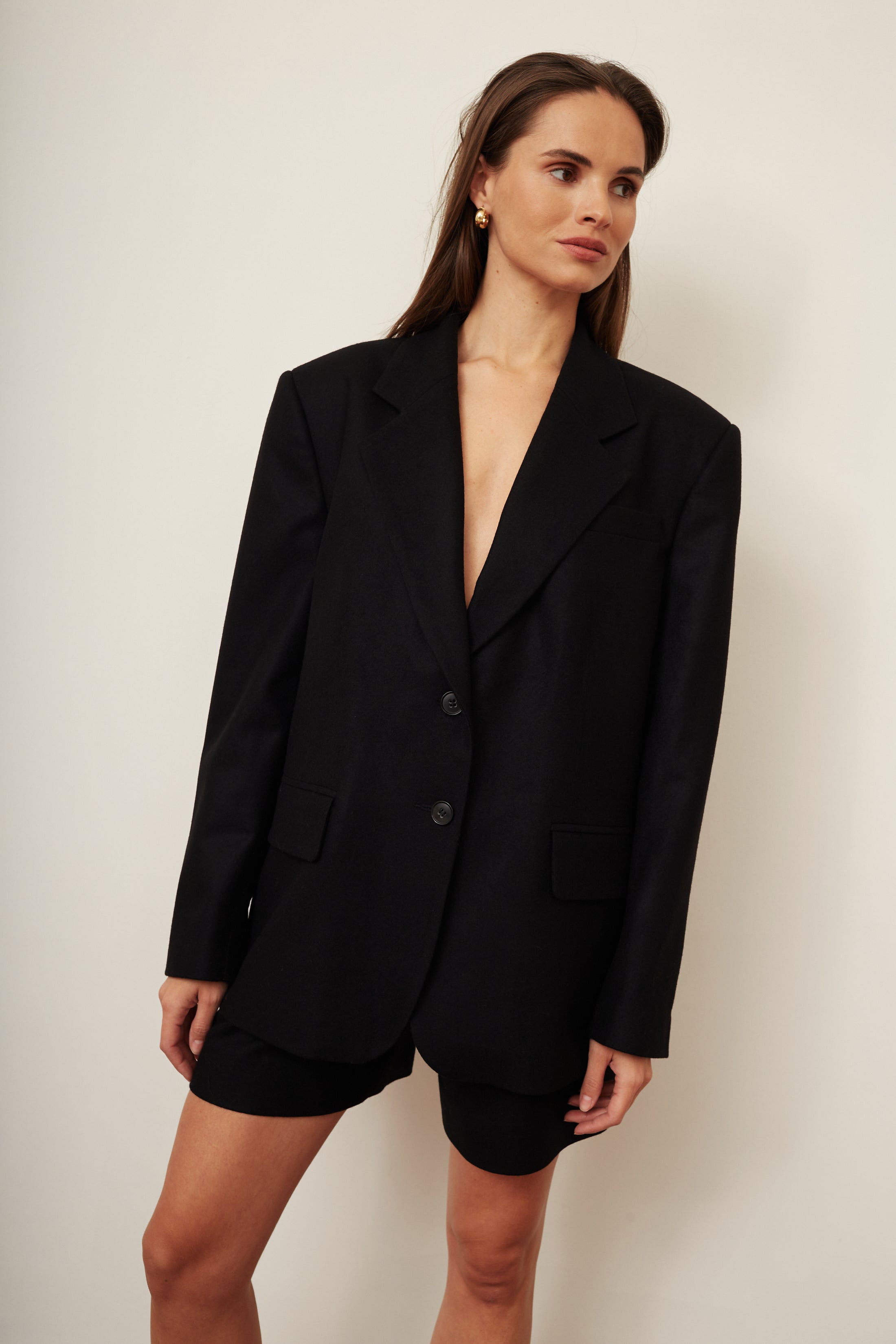 Jednorzędowa marynarka zainspirowana męską garderobą. Marynarka o prostym, luźnym kroju wykonana z miękkiej wełny Merino w kolorze czarnym. Marynarka ma pudełkowy kształt z lekko poszerzoną linią ramion. Zapinana na czarne garniturowe guziki. Polecamy zestawić ją z szortami Max, wykonanymi z tej samej tkaniny lub z jeansami Nicolas.