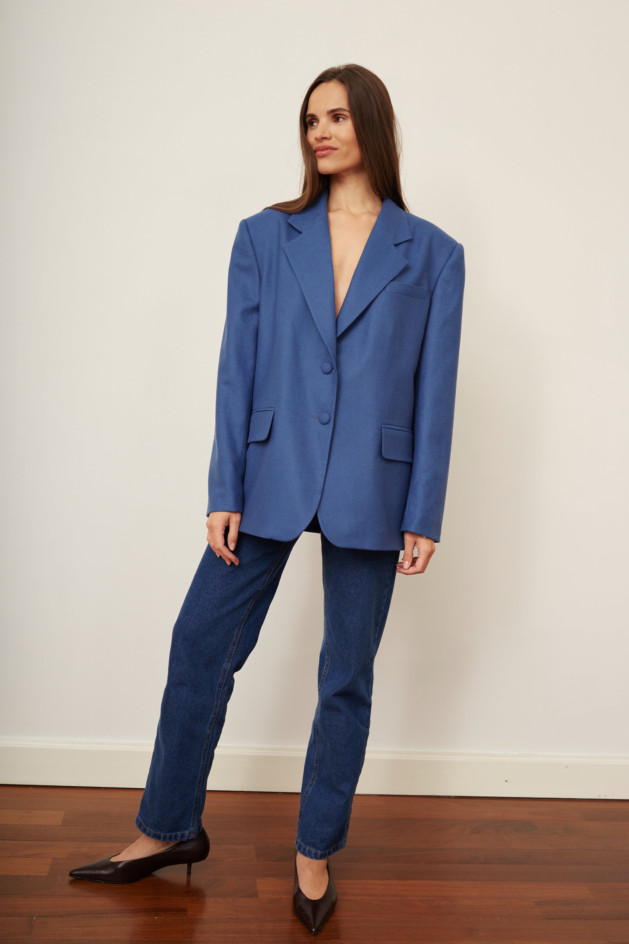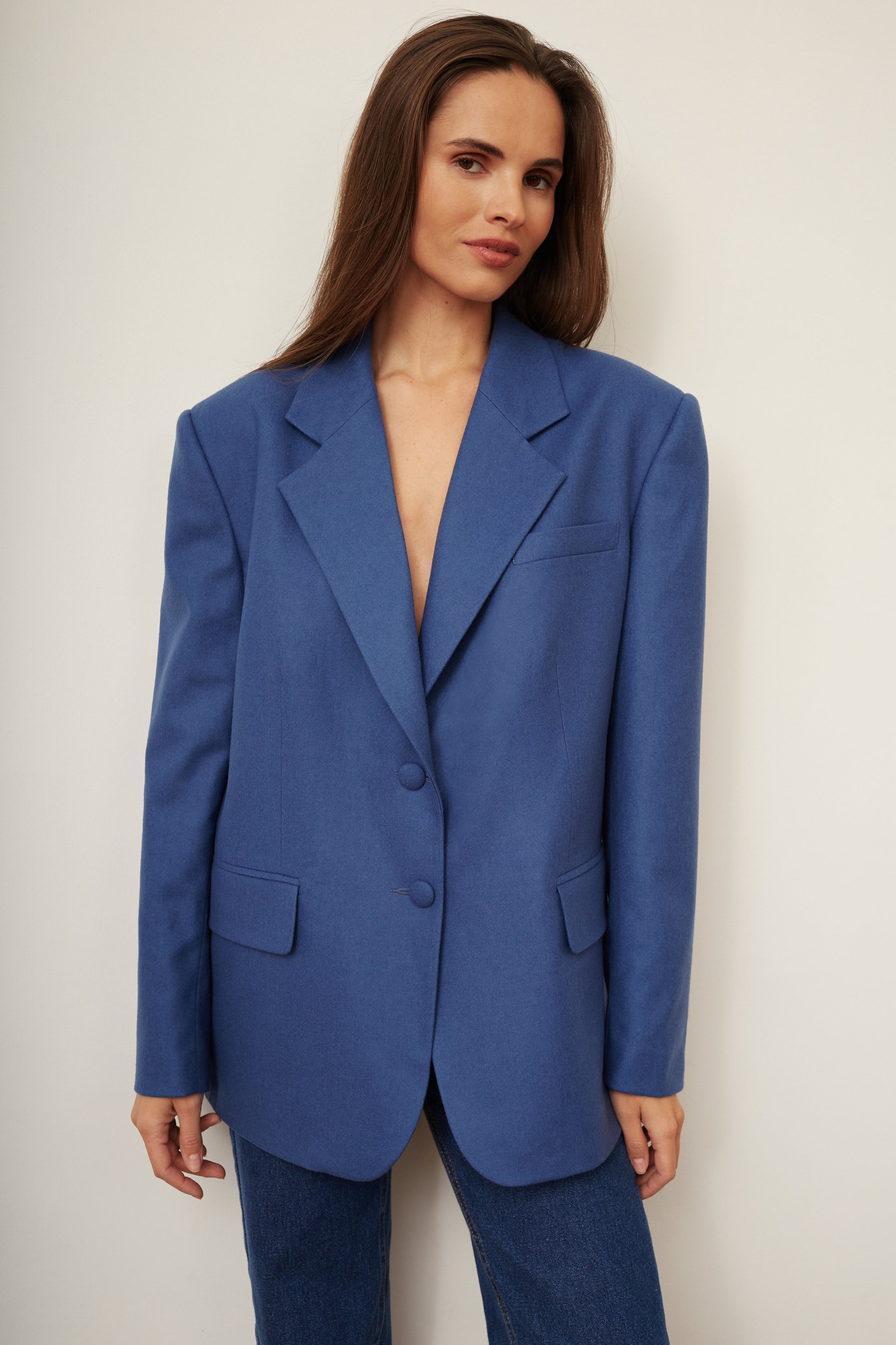 Jednorzędowa marynarka zainspirowana męską garderobą. Marynarka o prostym, luźnym kroju wykonana z miękkiej wełny Merino w wyjątkowym, twarzowym kolorze. Marynarka ma pudełkowy kształt z lekko poszerzoną linią ramion. Zapinana na oblekane tkaniną guziki. Polecamy zestawić ją z naszymi jeansami Nicolas.