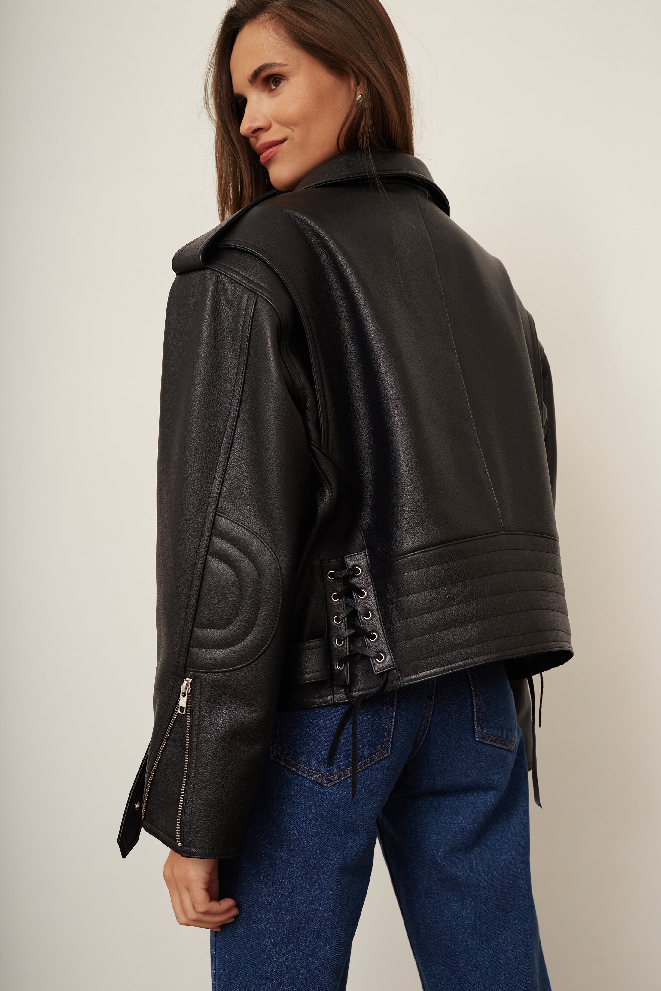 Kurtka została uszyta w Polsce z włoskiej skóry bydlęcej.