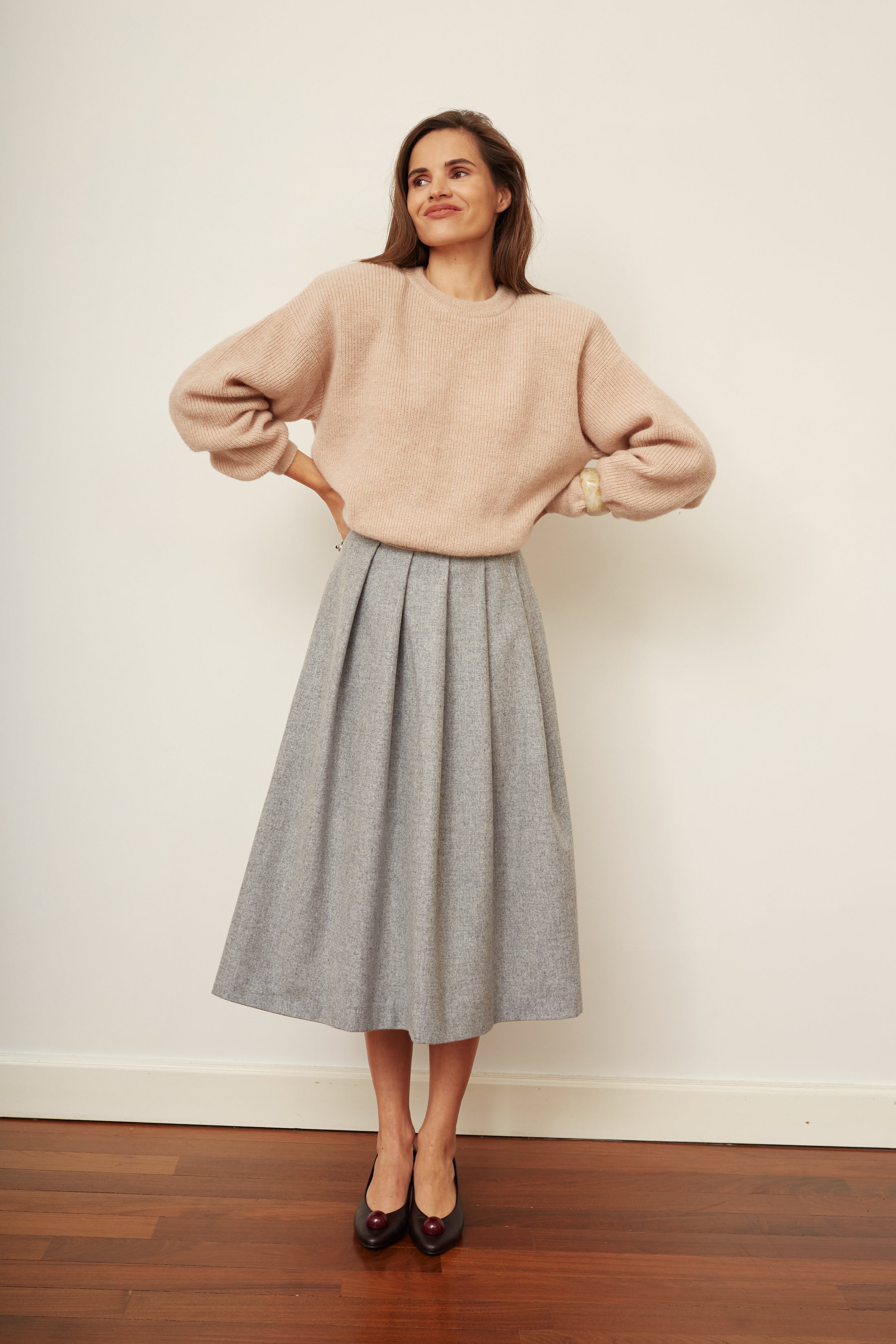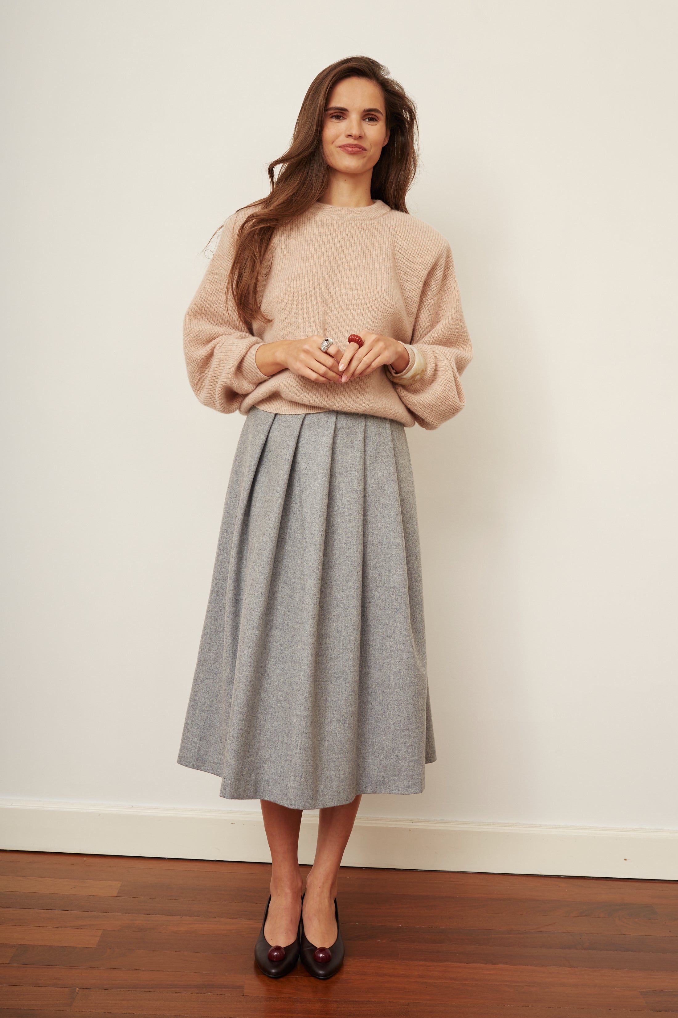 Spódnica o długości midi wykonana z wełny Merino w kolorze jasnoszarym.