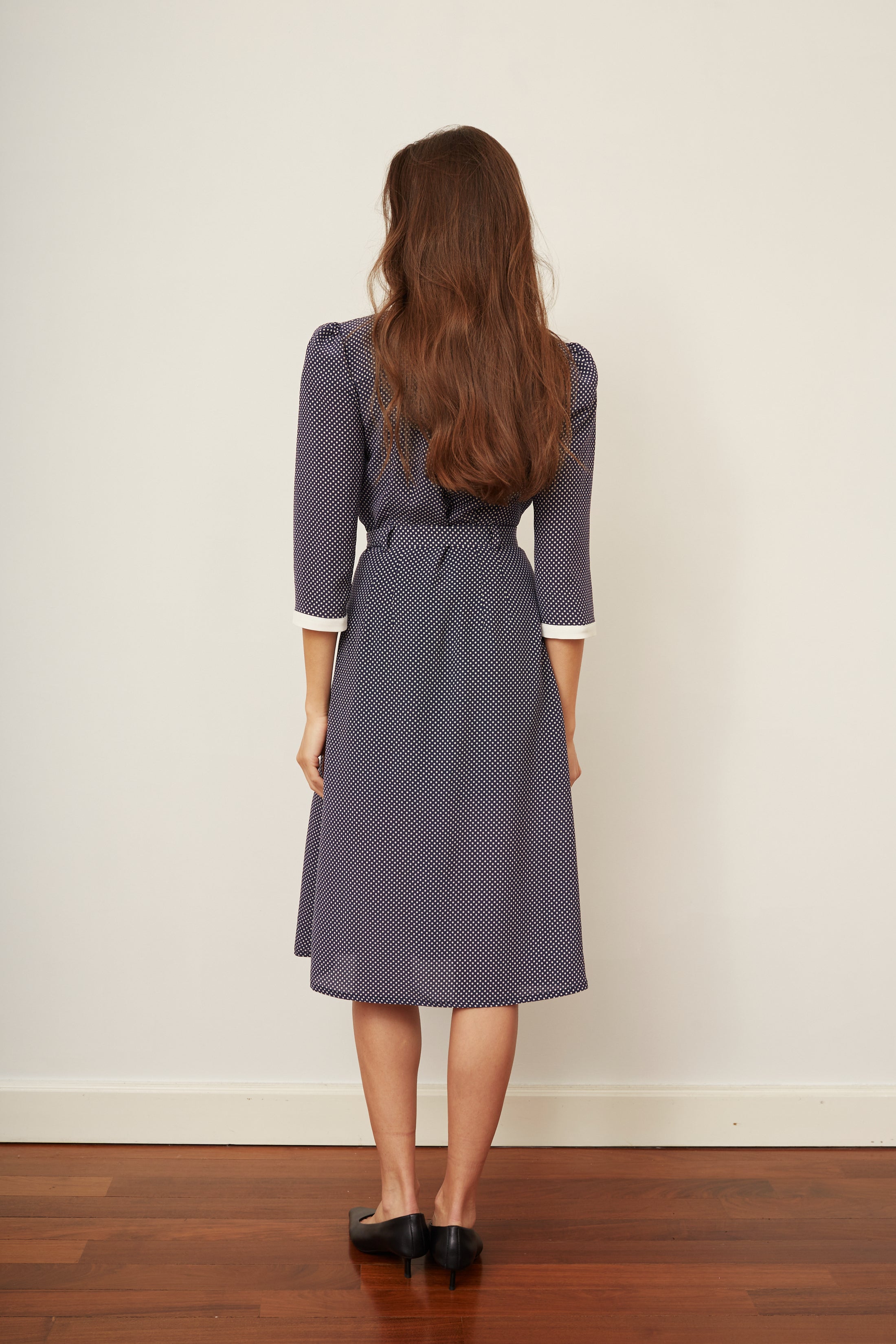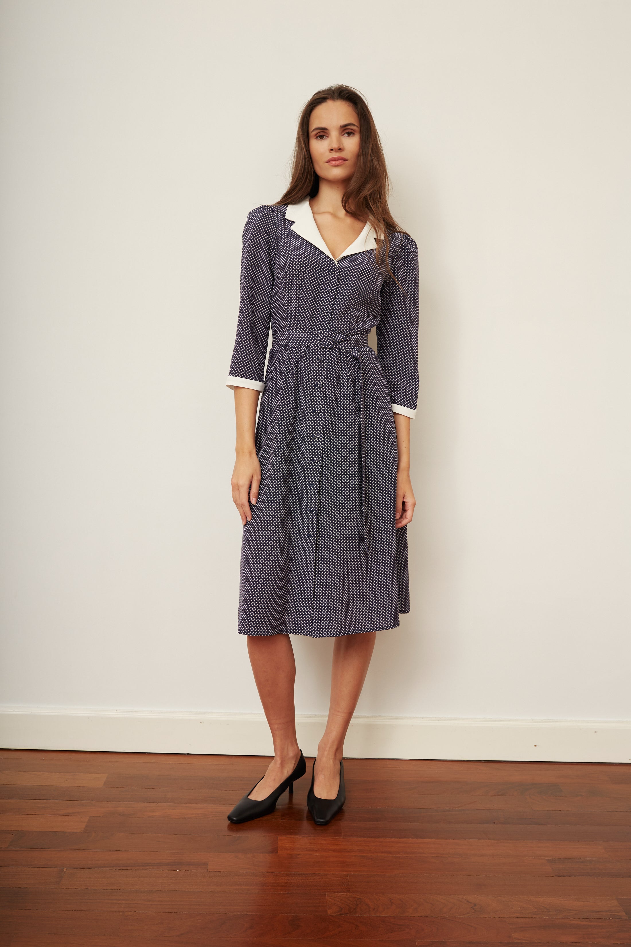 Jeśli jesteś fanką sukienek w stylu retro w nowoczesnej formie, sukienka Caroline jest właśnie dla Ciebie. Wykonana z jedwabiu w naszym ulubionym wzorze w kropeczki, wykończona białym kołnierzykiem i mankietem.