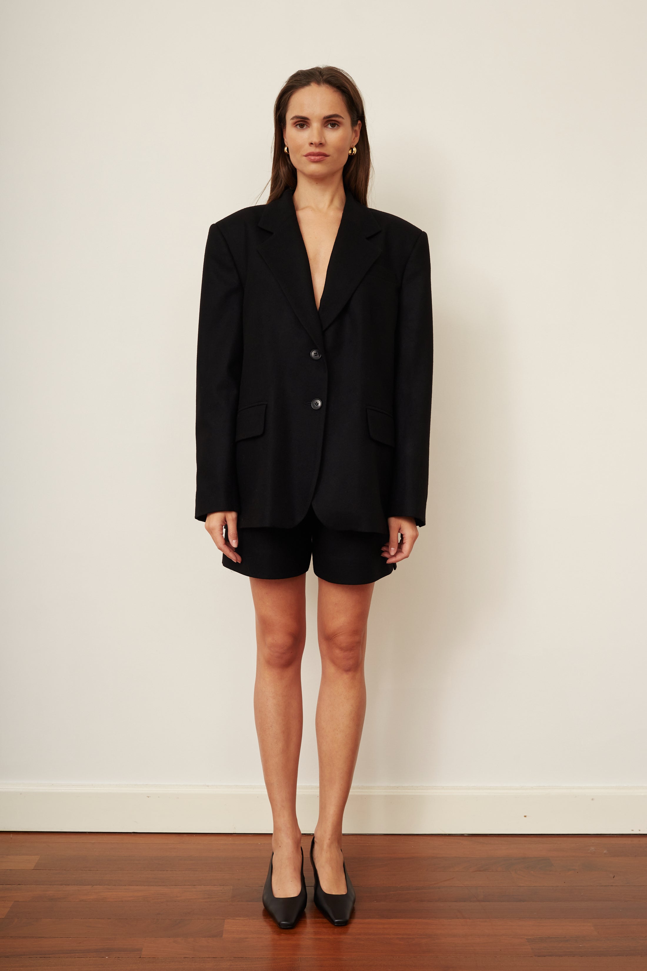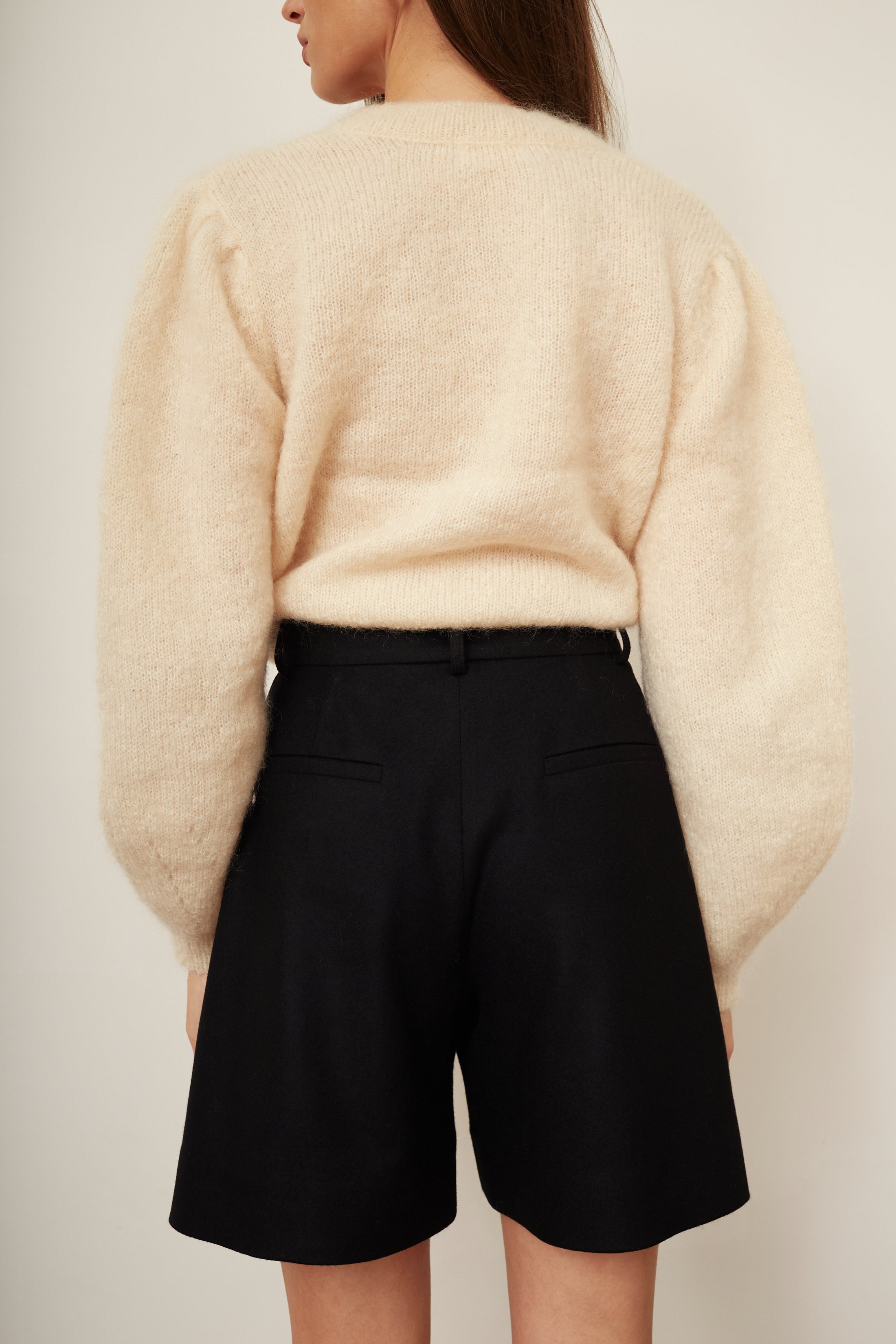 Szorty z wysokim stanem wykonane z wełny Merino w kolorze czarnym. Szorty mają zakładki oraz luźną nogawkę. Od spodu podszyte są wiskozową podszewką.